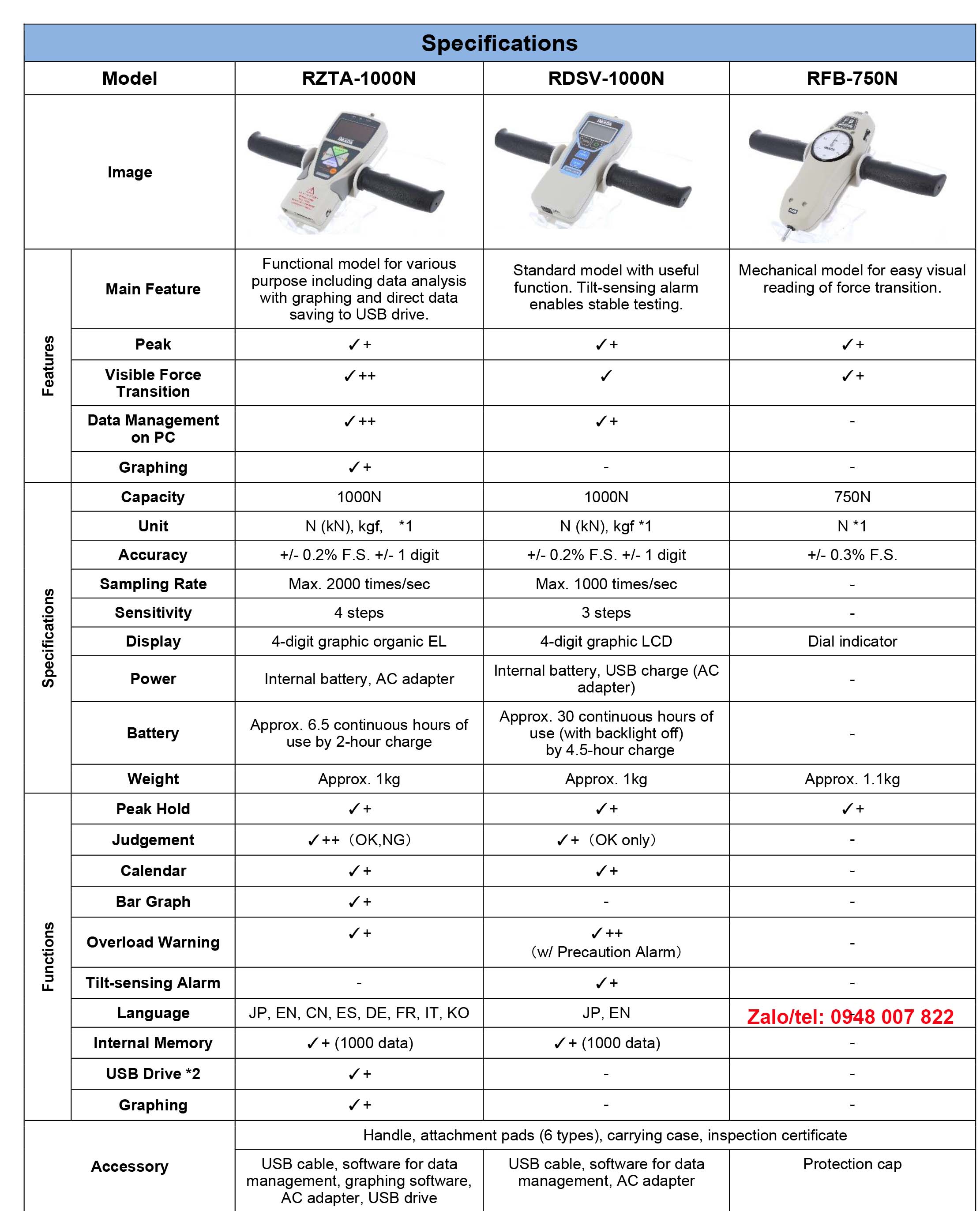 Thông số kỹ thuật Đồng hồ đo lực kéo nén Imada RZTA-1000N, RDSV-1000N, RFB-750N