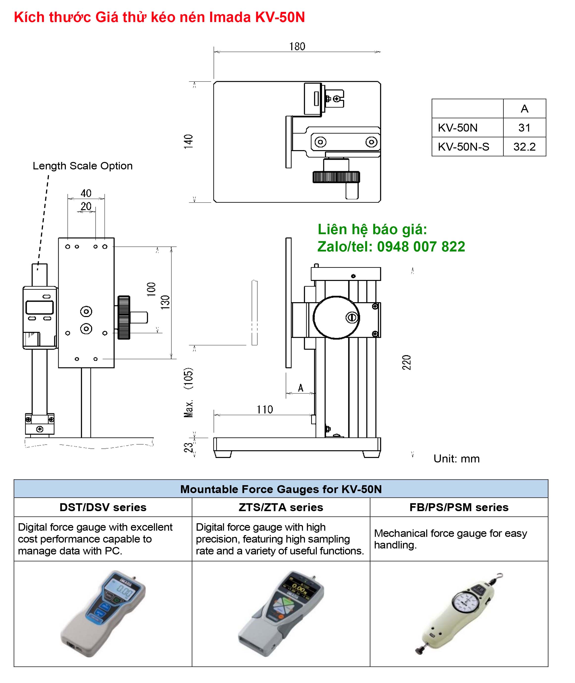 Thông số kỹ thuật Giá thử kéo nén Imada KV-50N