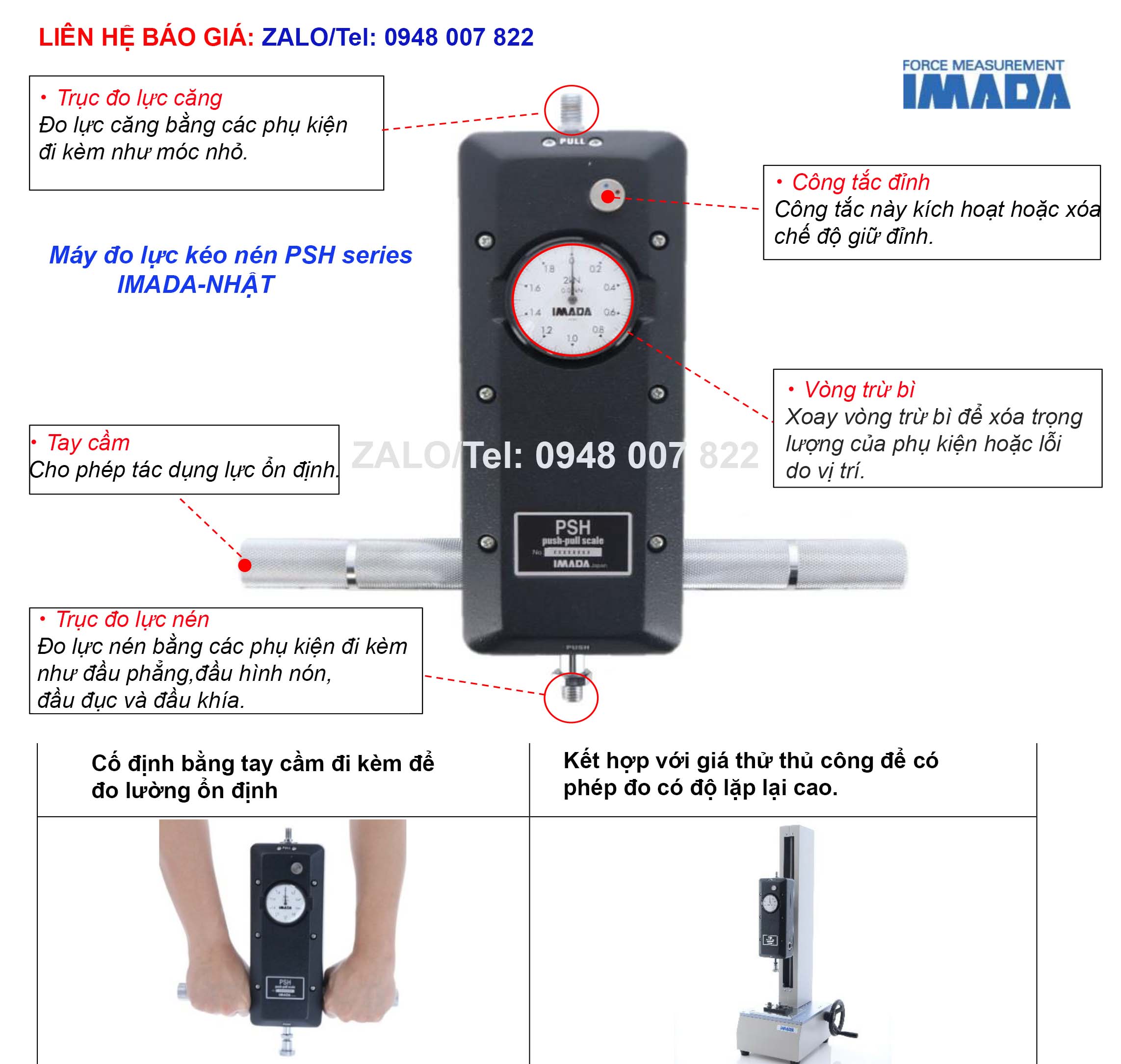 Máy đo lực kéo nén PSH series Imada (hay đồng hồ đo lực kéo nén PSH-500N; PSH-1000N; PSH-2000N; PSH-3000N; PSH-50K; PSH-100K; PSH-200K; PSH-300K IMADA). Đồng hồ đo lực cơ học loại công suất lớn có khả năng chịu lực lên đến 3000N. Đo cả hai lực nén và kéo, được trang bị cơ cấu kim dừng giúp kim dừng lại ở giá trị cực đại.
